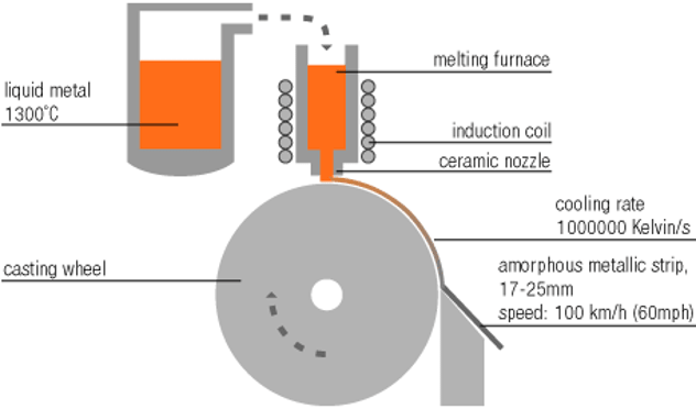 Течащата по повърхността на барабана метална сплав е с много малка дебелина – от 20 до 30 микрона. Охлаждането и е със скорост от около 1 000 000 градуса в секунда. При това бързо преминаване от течна в твърда фаза няма време за образуване на кристална структура. Вместо това се получава аморфна структура. Това и определя уникалните качества на материала и възможността за нестандартното му приложение в различни сфери, вкл. и за отоплителни системи..